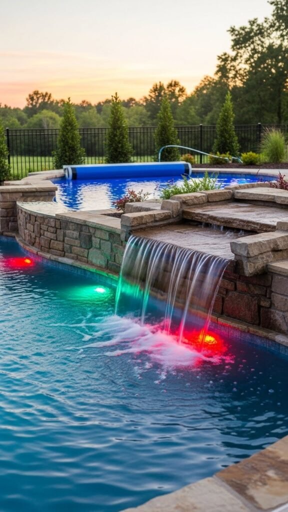 Imagine stepping into your backyard and hearing the steady rush of a waterfall while colorful LED lights dance across the water — a custom pool like this turns evenings into an experience.
