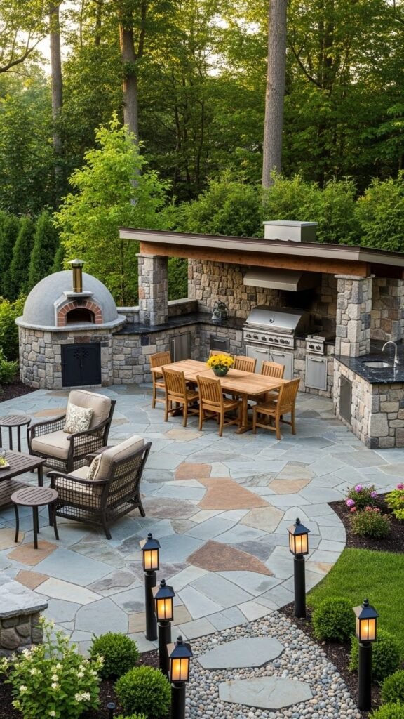 You’ll add a stone pizza oven, durable seating, and a lantern pathway for night cues, keeping layout open so you can roam and host freely.