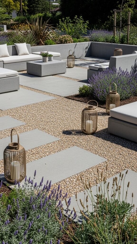 After enjoying a covered stone cooking area, you can shift part of your yard into a mixed concrete and pea gravel lounge that balances hard-edge structure with soft, walkable texture.