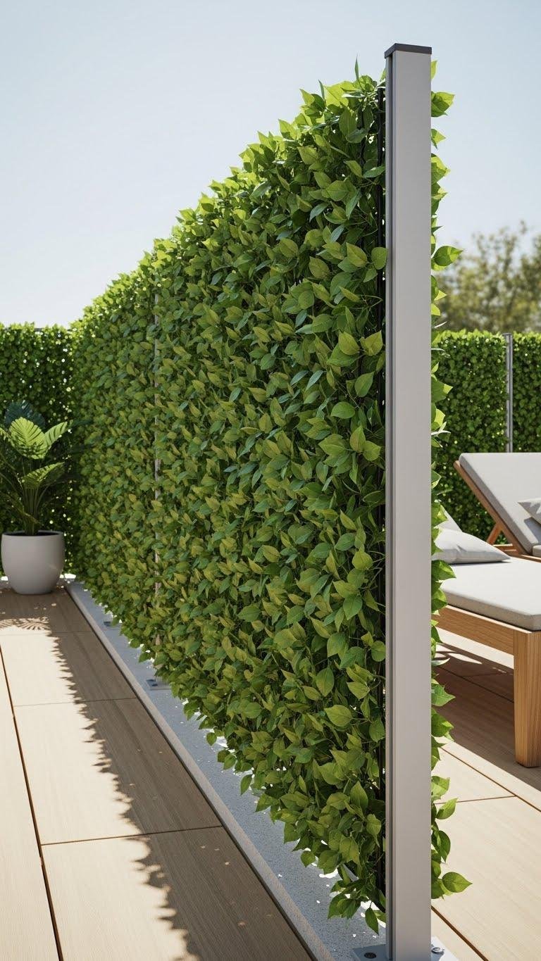 A row of faux leaf panels mounted on slim metal posts transforms your balcony into a green screen that looks lived-in and lasts through seasons. You’ll appreciate the clean silhouettes, powder-coated metal posts and modular clips that prioritize UV durability and wind resistance.