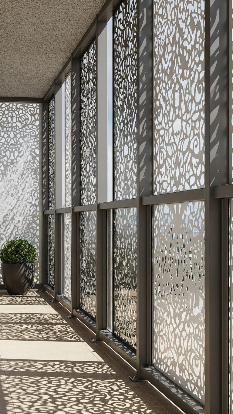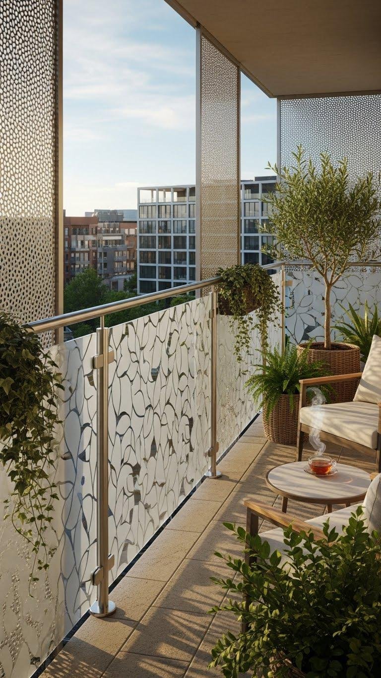Often you’ll want to soften glass railings without losing their light and views; etched or frosted films, perforated metal screens, and laminated interlayers let you tune opacity precisely.