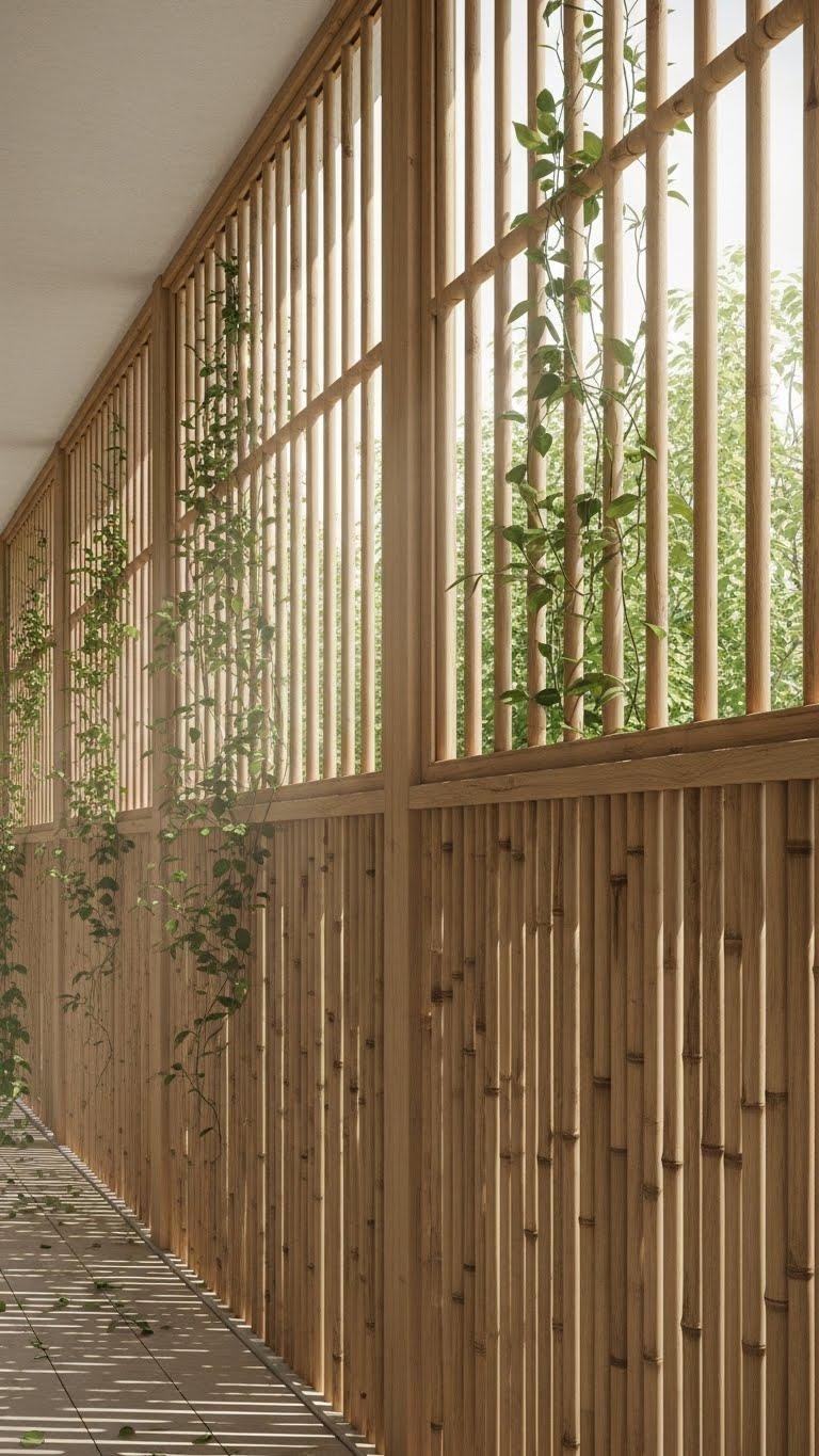 Lean into airy screening with bamboo or lattice fencing that lets breezes and dappled light play through while still giving you privacy; these options feel handcrafted and breathable, not bulky.