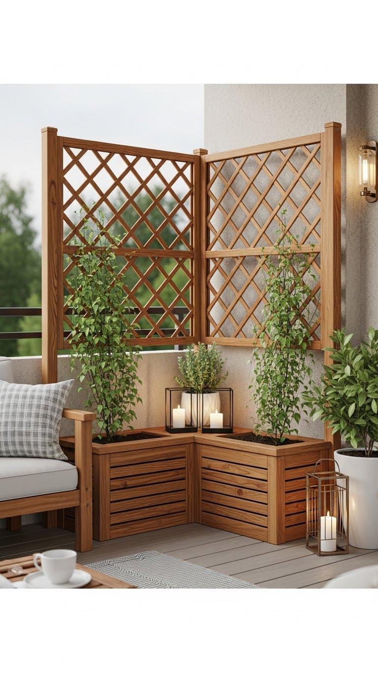 An L-shaped wooden trellis anchors the corner with sculptural clarity, tracing two planes that both define your balcony and invite vertical life. You choose a corner lattice of tight geometry, rich grain, and a weatherproof stained finish that deepens tone.