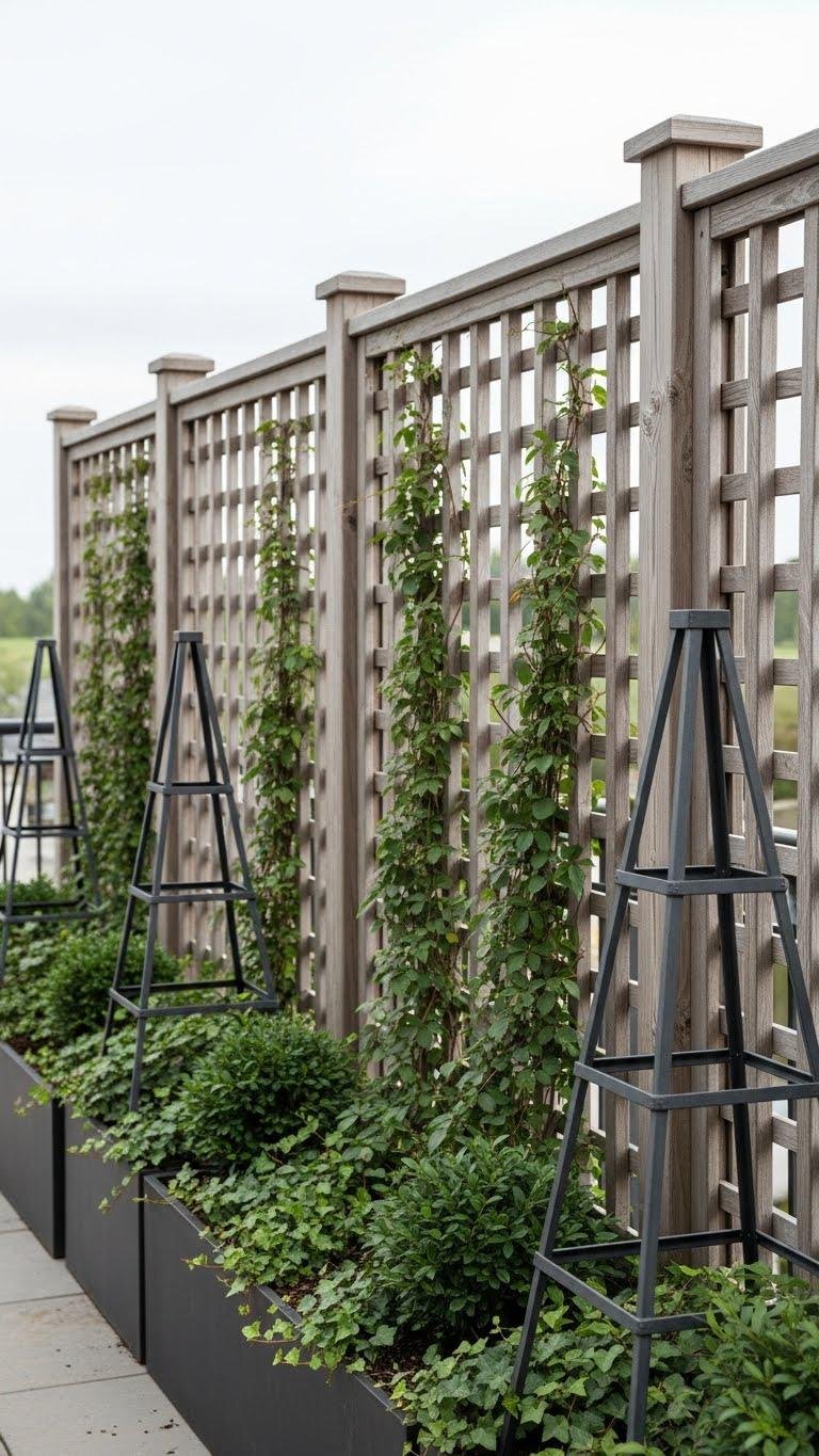 You’ll choose weathered cedar or powder-coated steel, combining vertical lattices with compact obelisks to sculpt vines without crowding.