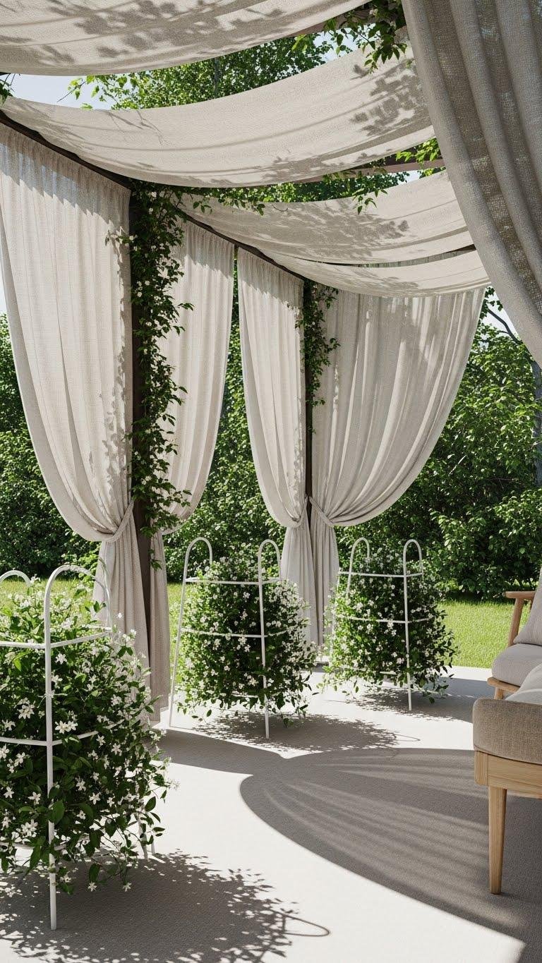 When you weave airy drapes and climbing vines through a pergola’s beams, the structure becomes a living room under the sky—soft fabrics filter sunlight and leafy tendrils trace shifting patterns of shade.