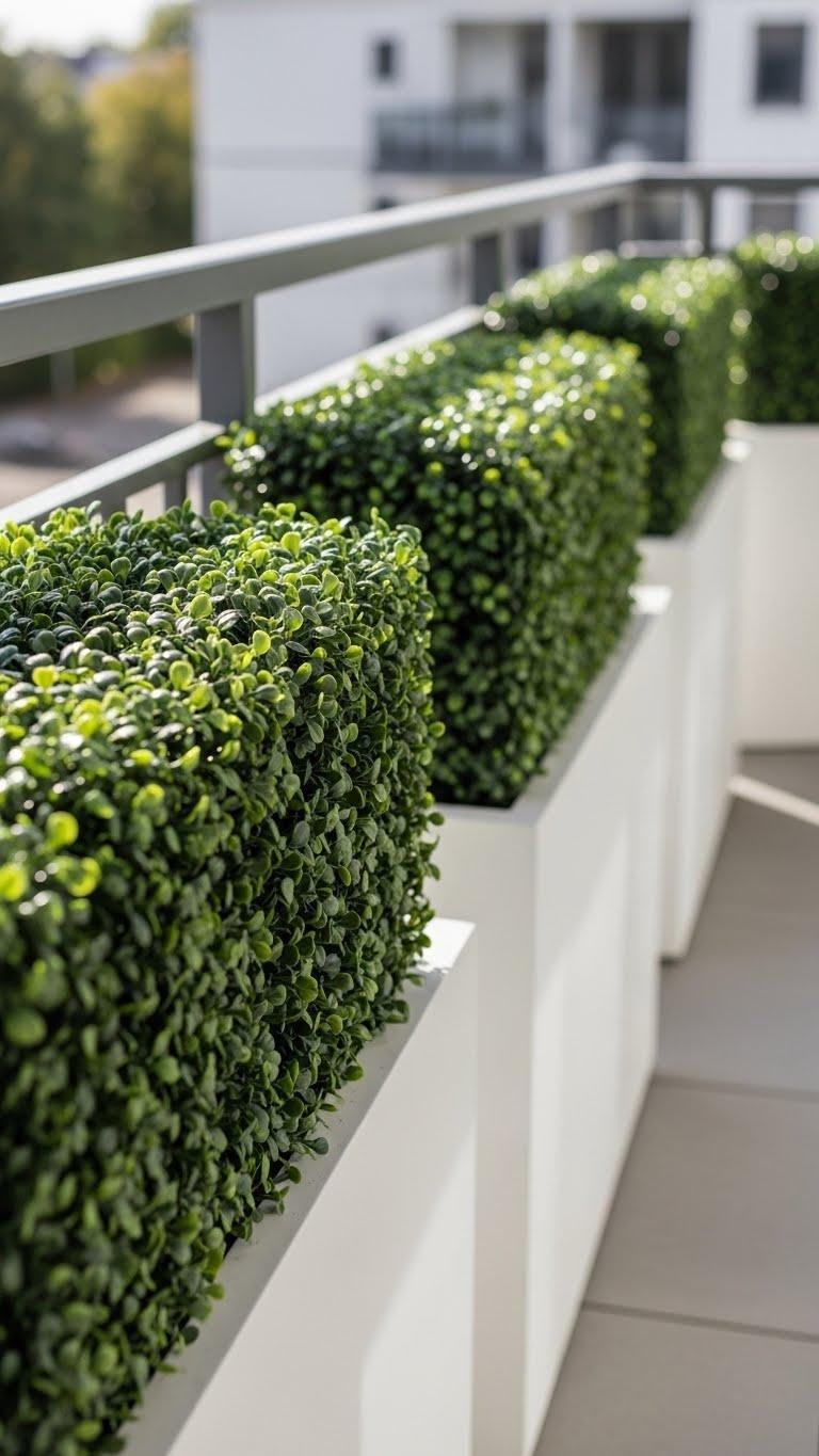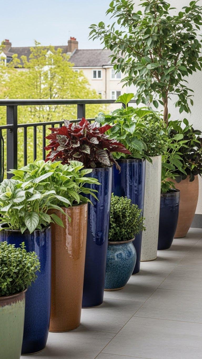 A row of sculptural pots turned privacy screen can transform a balcony into a secluded green haven, letting you curate height, texture, and rhythm with intention.