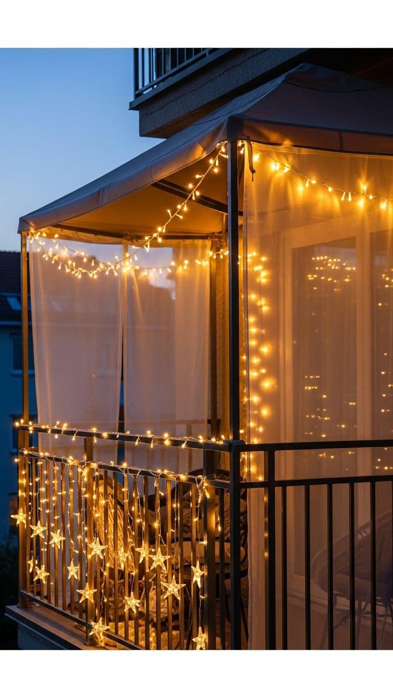 Drape strands of warm fairy lights across a balcony canopy or hang them behind sheer panels to soften harsh edges and gently veil the view; they’ll turn your railing into a luminous skin that balances privacy with openness.