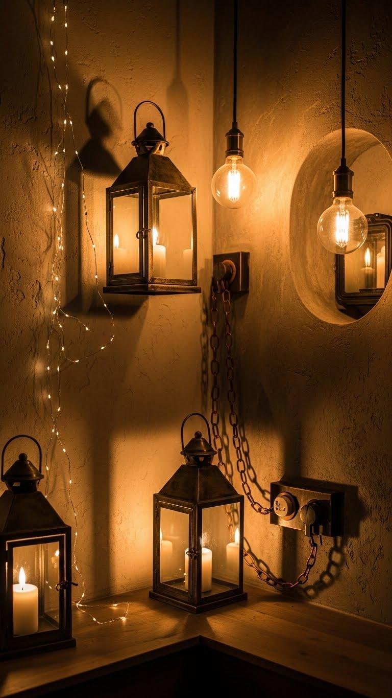 You’ll place weathered brass lanterns to cast candle silhouettes against textured walls, pair matte glass with warm Edison pendants for sculpted pools of light, and arrange dimmers and copper chains so each nook feels intentionally sheltered and free.