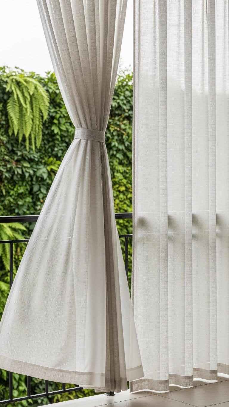 If the vertical greenery creates a sculptural backdrop, airy outdoor curtains give that same balcony a softer, more tactile edge—letting you calibrate privacy by touch and light rather than foliage.