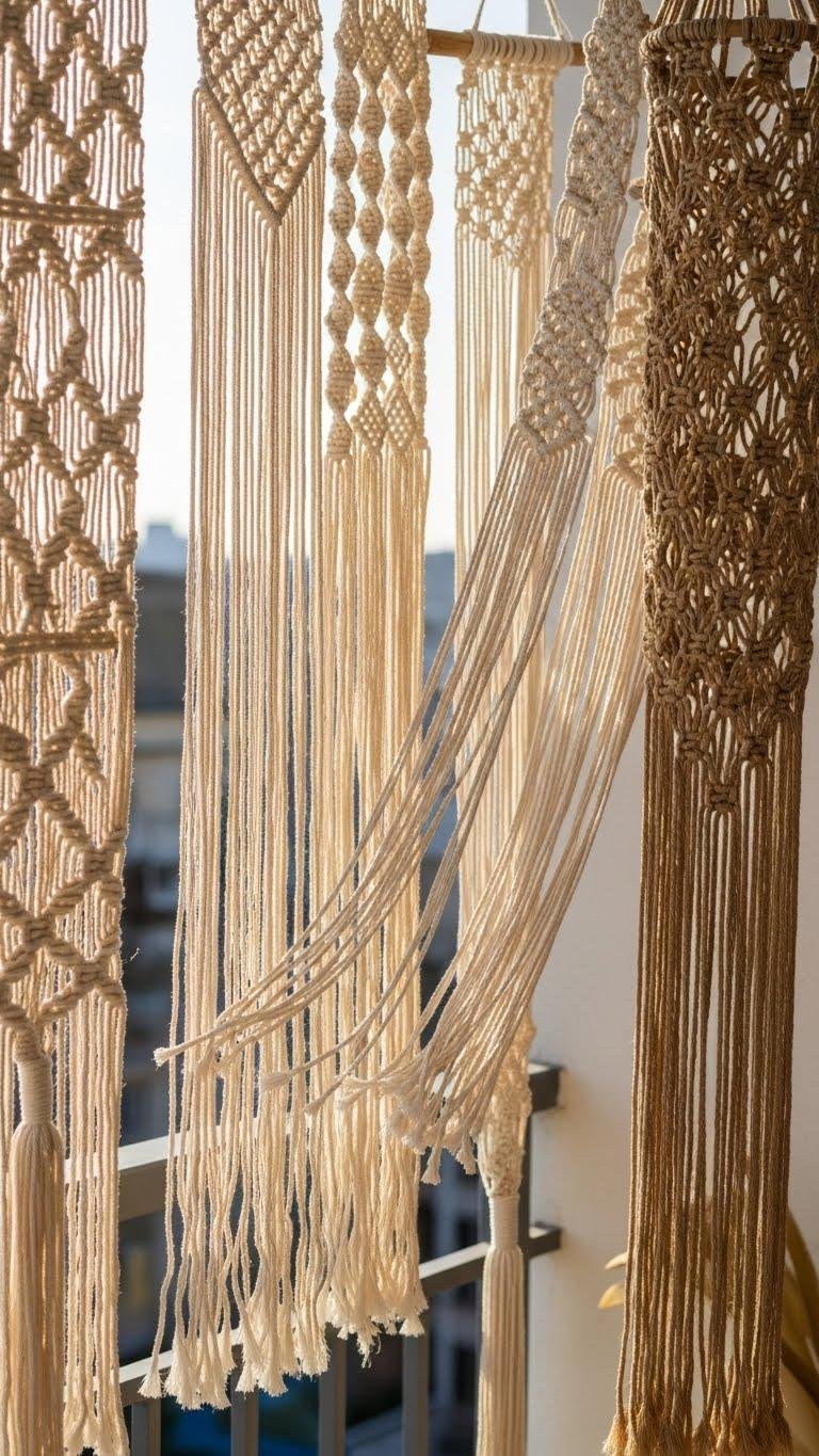 Boho macramé hangings act as tactile screens that soften sightlines while adding handcrafted texture to your balcony—knotted cotton, jute, or hemp create patterns that both veil and vent, casting lacy shadows as breeze moves through.