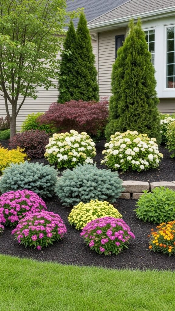 Anchor your foundation planting with a few strategically placed evergreens, then layer shorter shrubs and seasonal perennials outward to create year-round structure and changing color.