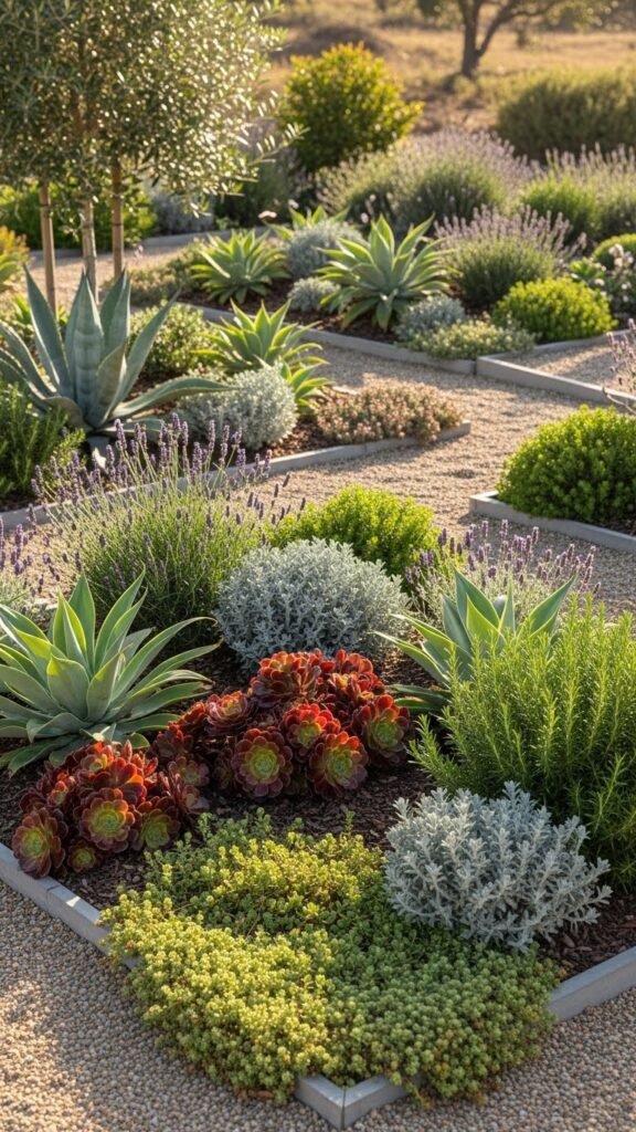 You’ll combine Mediterranean succulents, grey leaved shrubs and sage tones, position gravel drainage, mulch sparingly, and space for airflow so each plant thrives with minimal fuss.