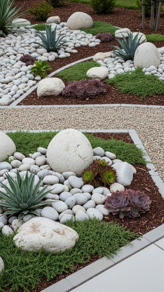 Think of a minimalist rock and low-plant bed as a pared-back composition where each stone and plant has a clear job: define lines, reduce maintenance, and accentuate texture.