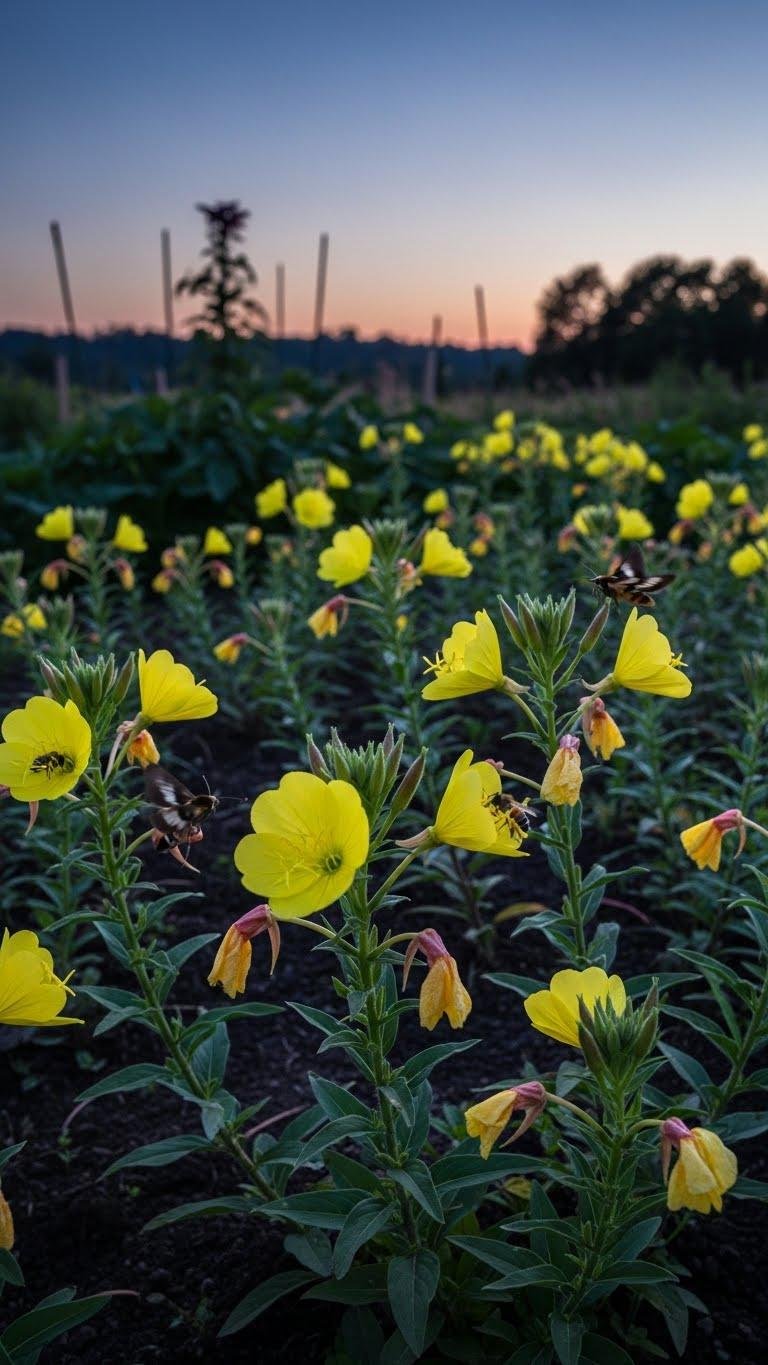 Bring evening primrose into your garden for a reliable source of late-day fragrance and pollinator activity; these hardy biennials and short-lived perennials open their lemon-scented, four-petaled flowers at dusk and attract moths and bees through the night.