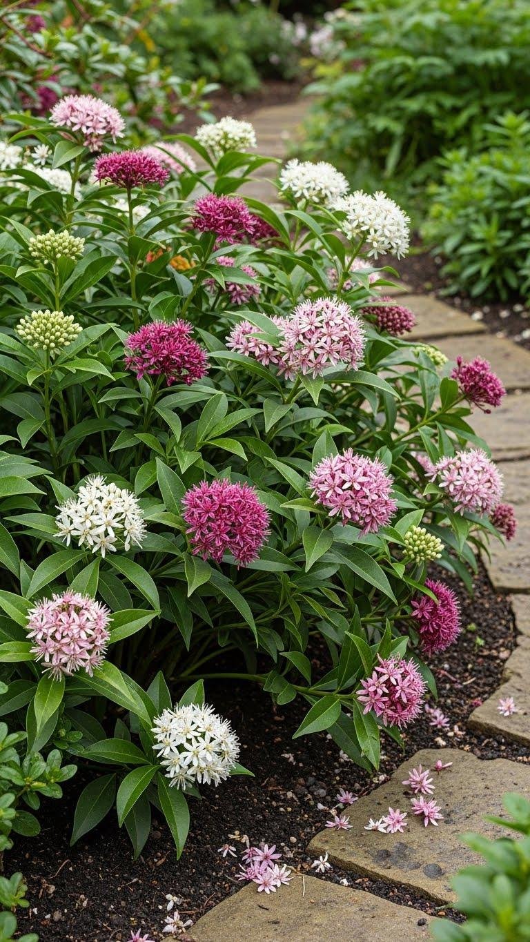 You’ll appreciate its evergreen habit, low maintenance and resistance to deer. Prune for shape after flowering, place in moist, well-drained soil, and rely on fragrant compounds in petals to perfume paths without overpowering nearby plantings.