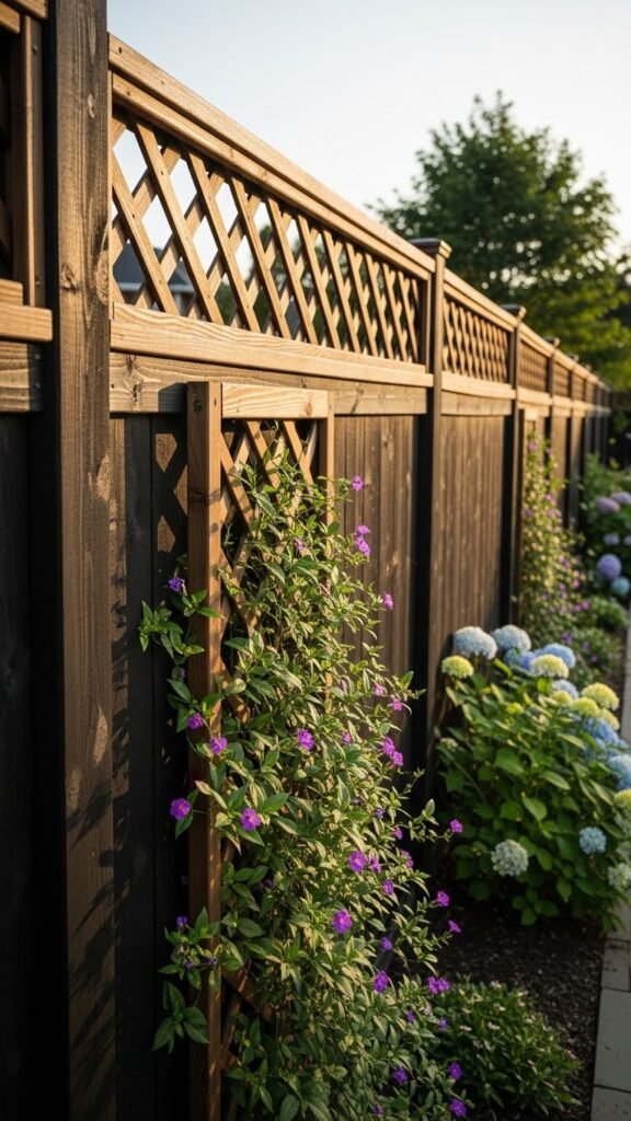 The decorative trellis lets climbing plants weave through, softening lines while preserving sight control. Install hardware flush, anchor posts precisely, and adjust panel angles to balance seclusion with ventilation.