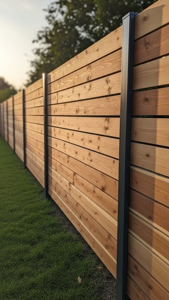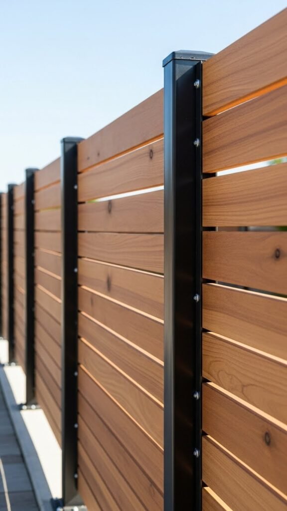 Pair sleek black metal posts with horizontal wood planks to create a modern, durable fence that balances industrial strength and warm, natural texture. You’ll mount evenly spaced posts with a matte finish, anchor them for rigidity, and fit tight horizontal planks for visual continuity and privacy.