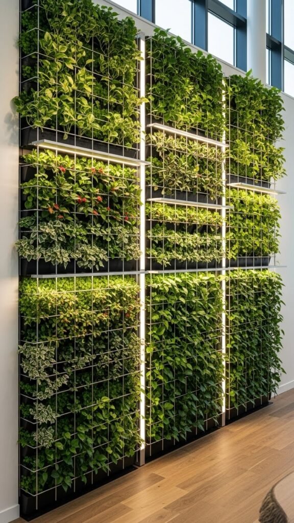 Blending structure and planting, a living wall with a built-in trellis integrates a load-bearing framework, planting modules, and climbing support into a single vertical assembly that you can mount on posts or a freestanding frame.