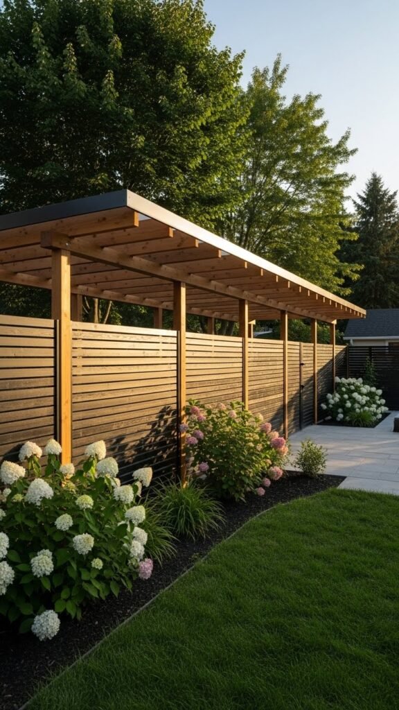 After your living wall and trellis anchor greenery to a vertical plane, a perimeter privacy fence with a pergola cap turns boundary screening into a structural crown that controls light, sightlines, and airflow.