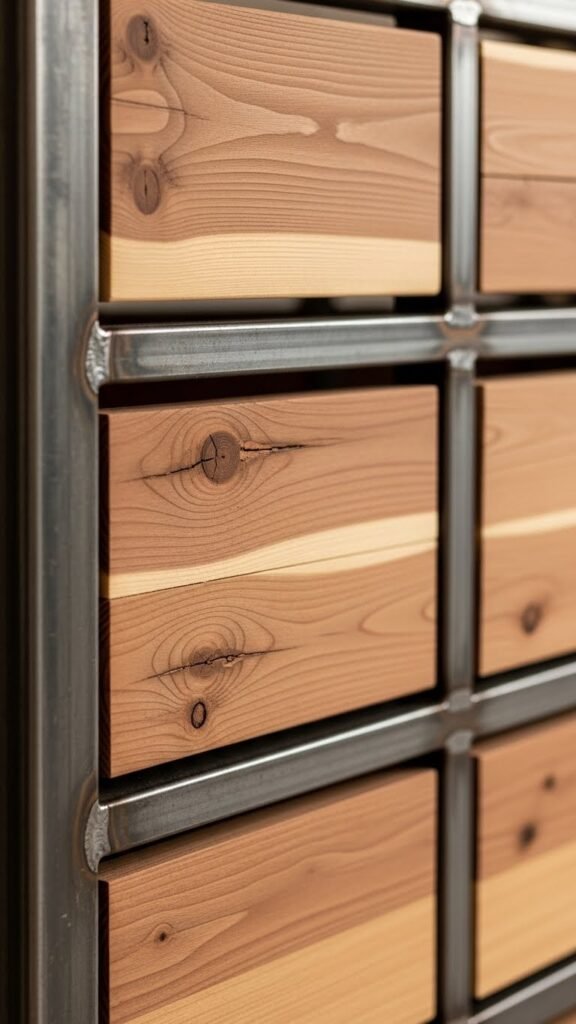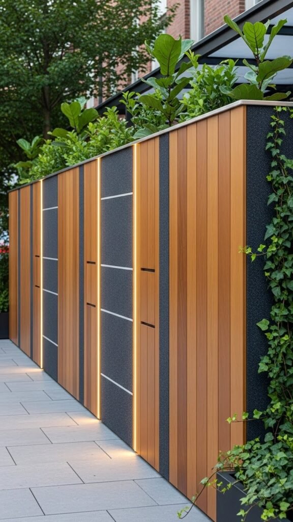 A hybrid iron-and-wood privacy wall combines steel’s structural strength with timber’s warmth, giving you a durable, visually layered barrier that resists sagging and weather stress.