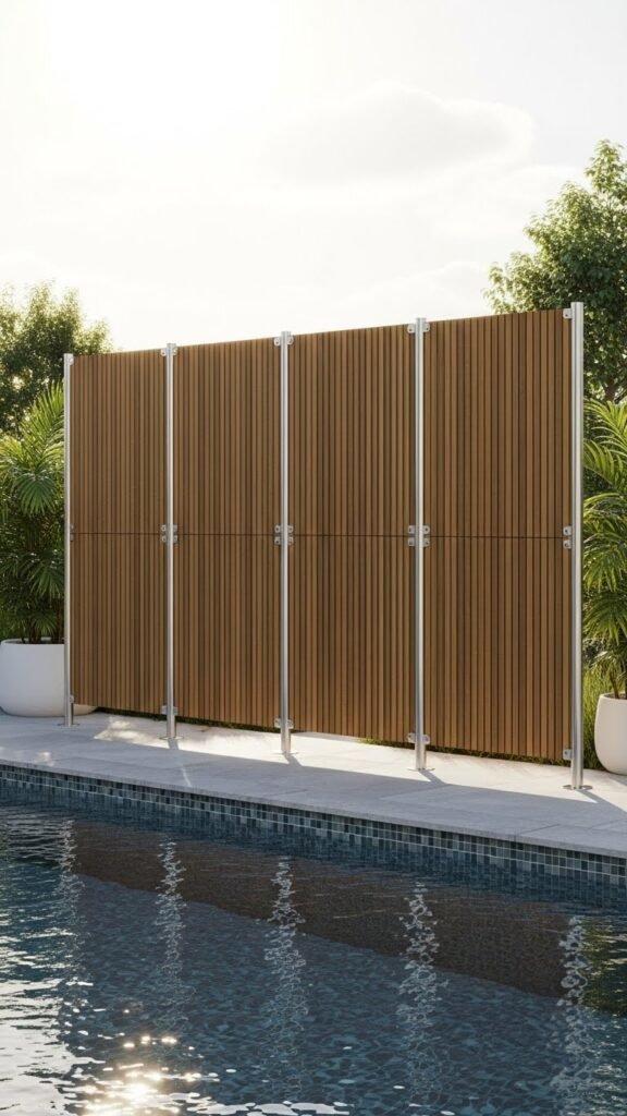 After a solid privacy wall has given you acoustic calm, a poolside bamboo and wood composite screen offers a lighter, water-resistant option that still controls sightlines and echoes.