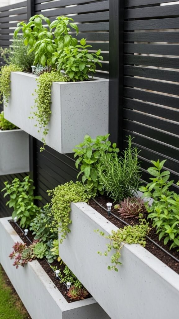 You’ll mount herb troughs and succulent troughs into reinforced ledges, route drip irrigation through concealed channels, and train vertical herbs on stainless anchors.