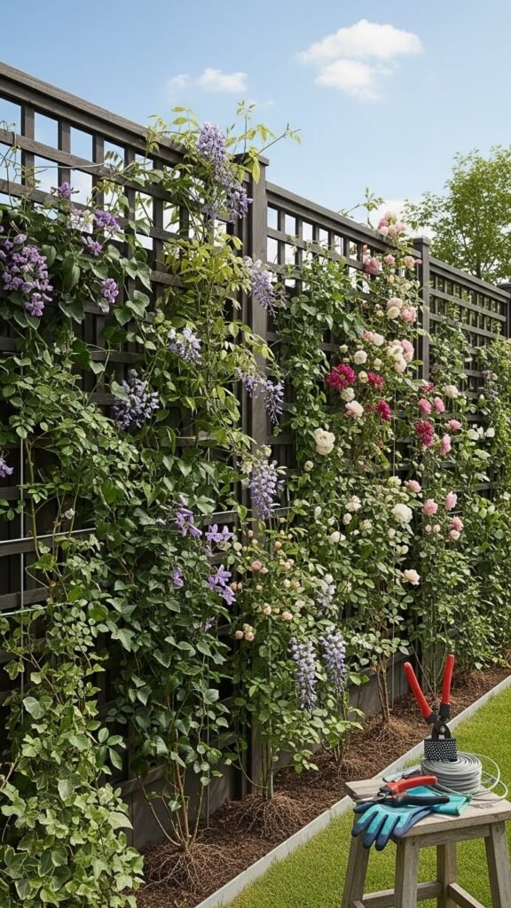 You’ll install robust panels for privacy screening, then mount a timber or metal trellis to support climbing vines.