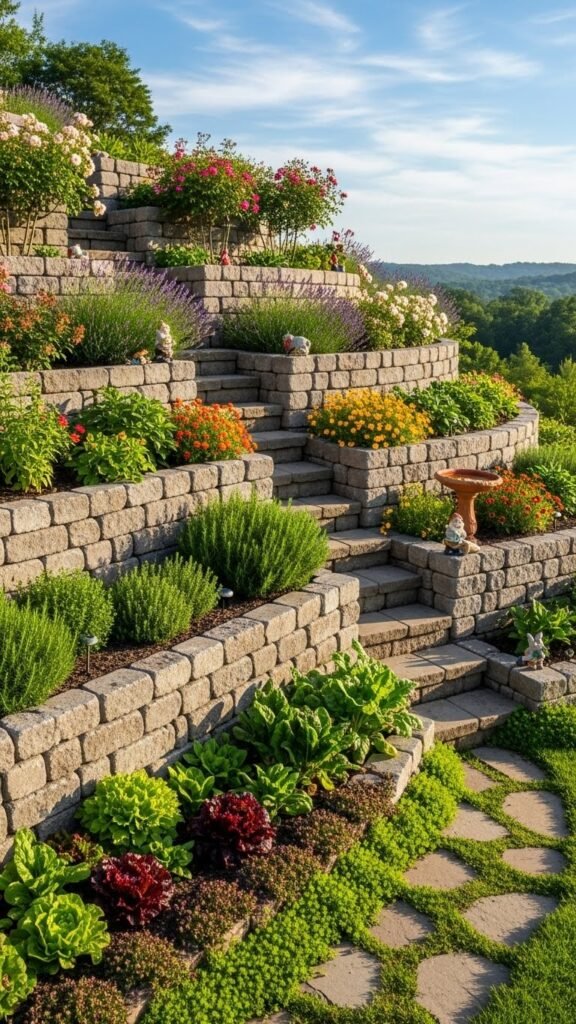 Staggering beds into multi-level terraces lets you work with slope and microclimates to boost usable growing area and control erosion; you’ll place higher beds for heat-loving crops and lower, moister shelves for greens and root vegetables.