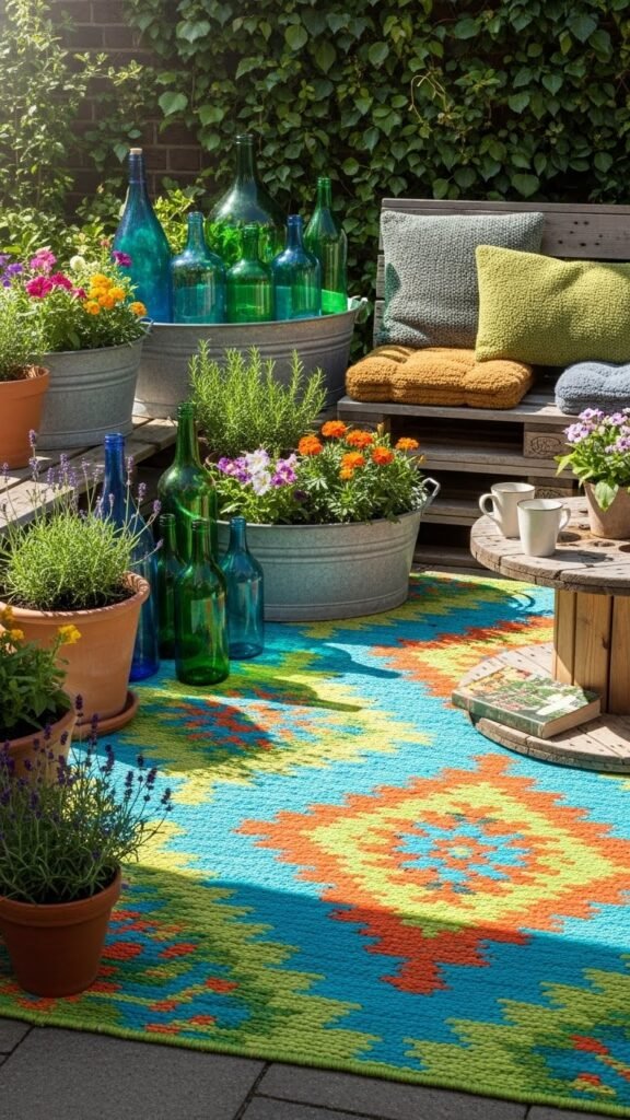 You’ll appreciate how a braided rug made from recycled materials adds tactile warmth and eco-conscious style to your garden seating area.