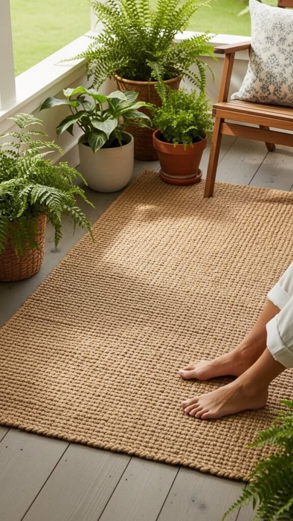 Drawing on natural fibers and warm textures, a jute rug anchors a covered porch with casual charm and plant-friendly style. You’ll love the woven warmth underfoot as pots and ferns cluster around it, creating layers.