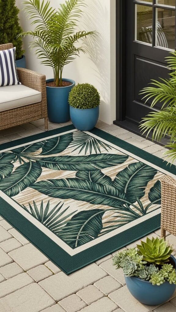 Bring a leaf-print rug onto your patio to conjure that luxe, tropical-resort vibe—think bold banana leaves, palm fronds, or layered philodendron silhouettes rendered in deep greens and sun-faded neutrals.