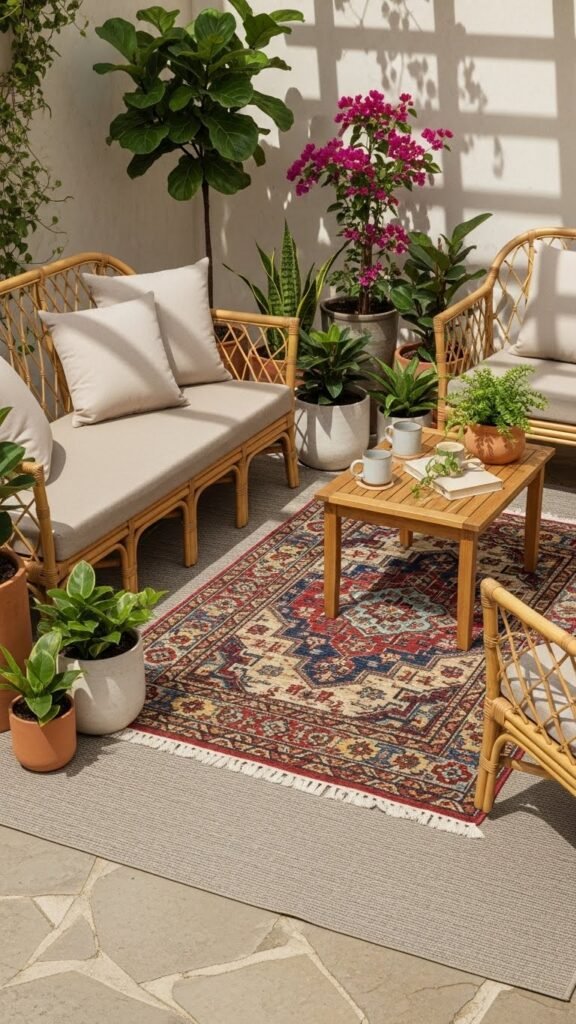 Often you’ll pick a large-scale floral rug to mimic the sweep of garden beds and bring that same layered, planted feeling onto your patio. Choose a vintage botanical palette and bold scale so patterns read from a distance.