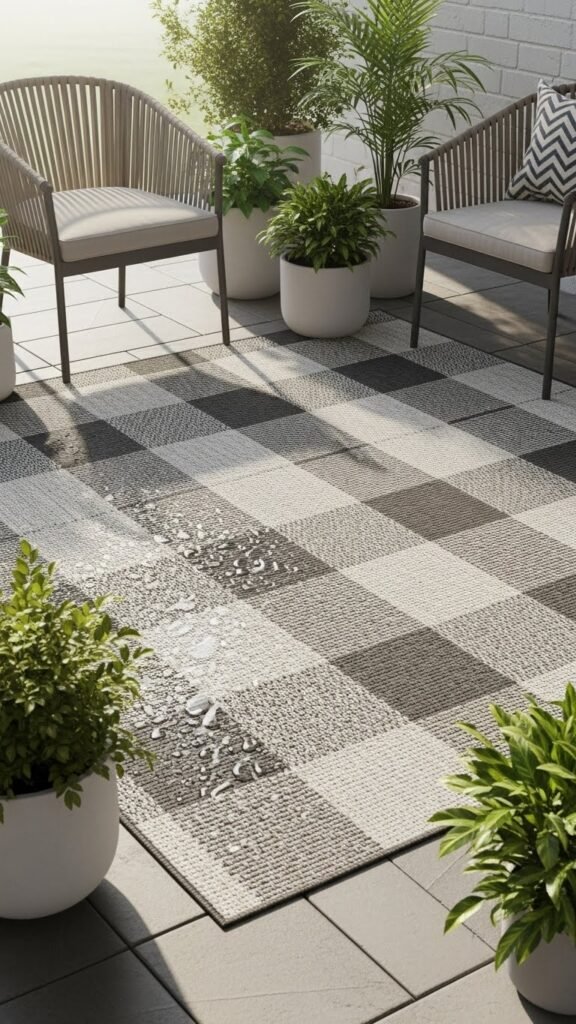 A neutral check rug with a water-resistant finish ties your patio together while standing up to spills and morning dew.