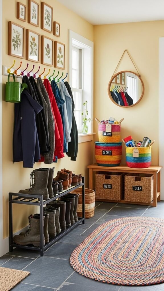 Pair it with entry baskets for gloves, seed packets and small tools, and install colorful hooks for coats and watering cans.