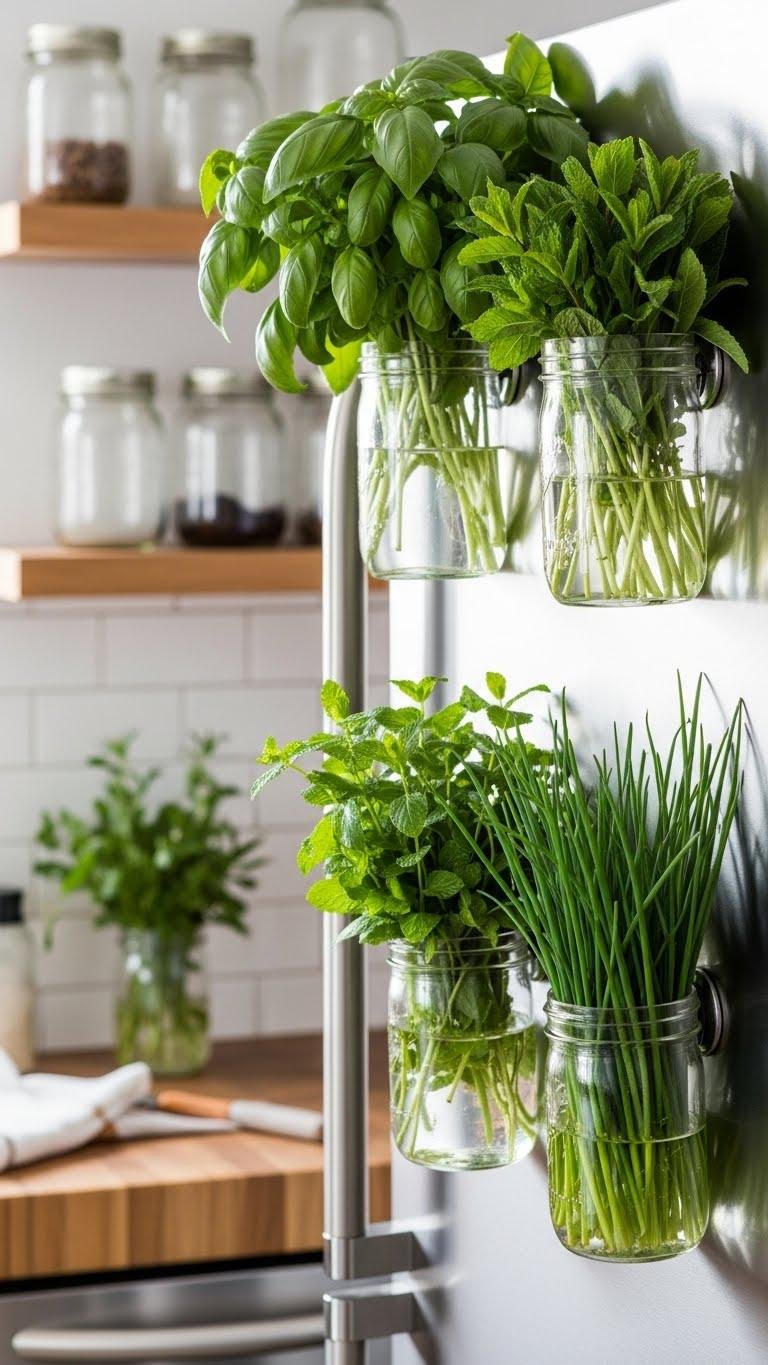 Line up mason jars on a butcher-block shelf or hang them from a rail to create a compact, charming herb cluster that keeps fresh greens within arm’s reach while saving counter space.