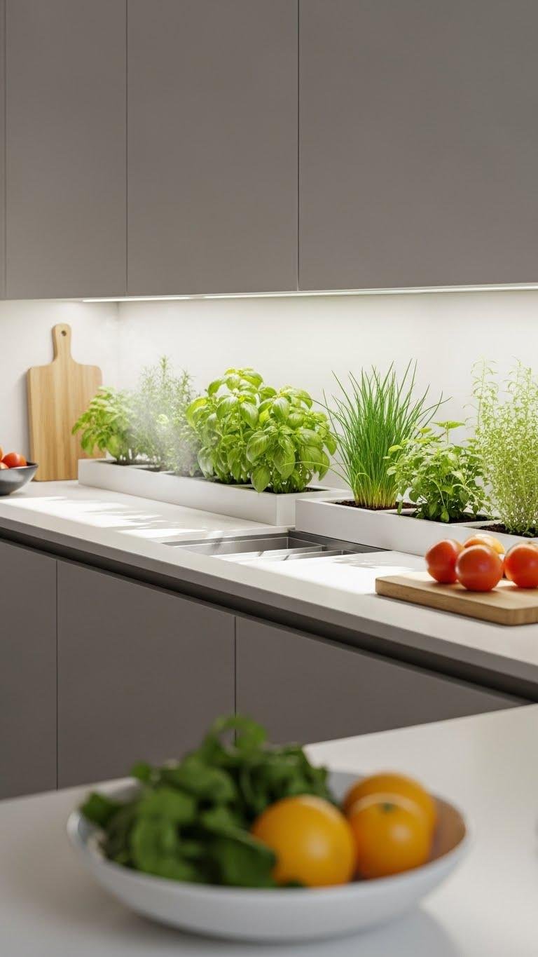 Tucked into the strip between your counter and upper cabinets, integrated backsplash planters make herbs part of your kitchen workflow, so you can snip basil or chives without stepping away from the stove.