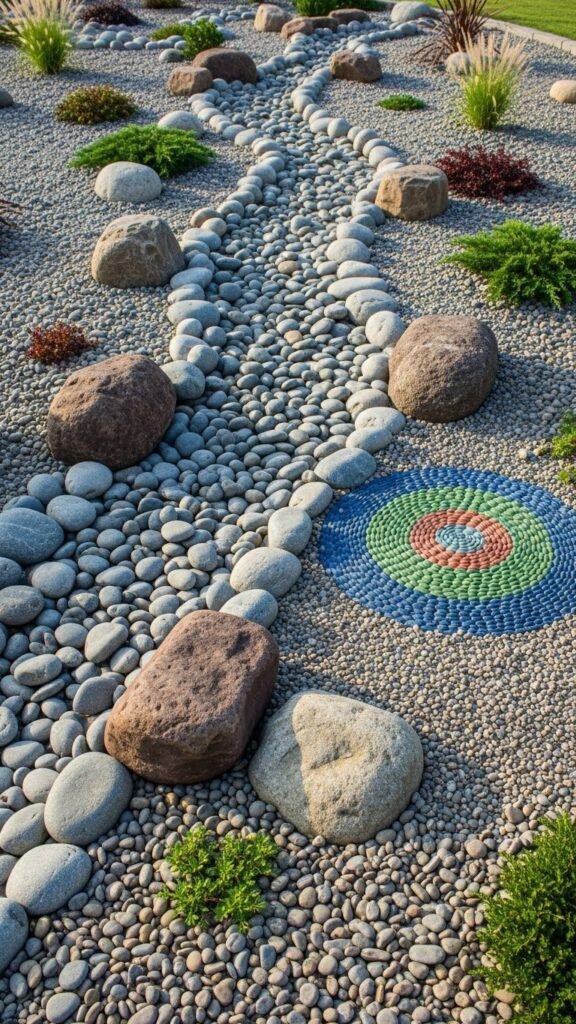 Gravel and river rock gardens offer a clean, low-maintenance alternative to lawns that still feels natural and designed. You can lay dry creekbeds to channel water, place larger river stones as anchors, and craft pebble mosaics for focal points.