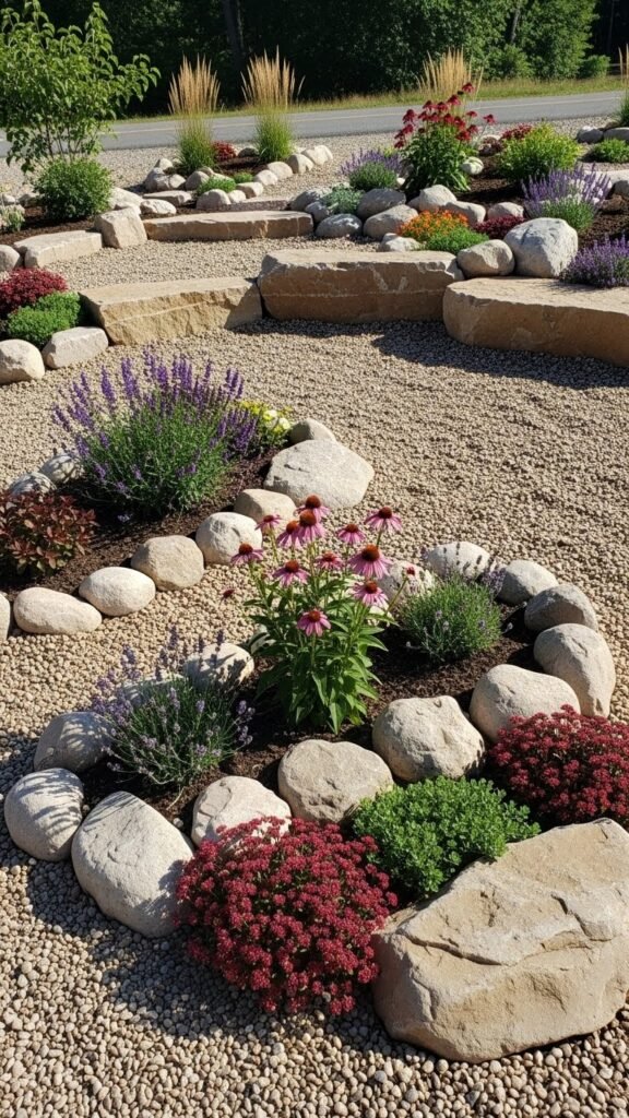 Mix boulder accents for texture and scale, stake a simple metal edge, and enjoy a tidy, free-feeling driveway that lets you spend less time working and more time living.
