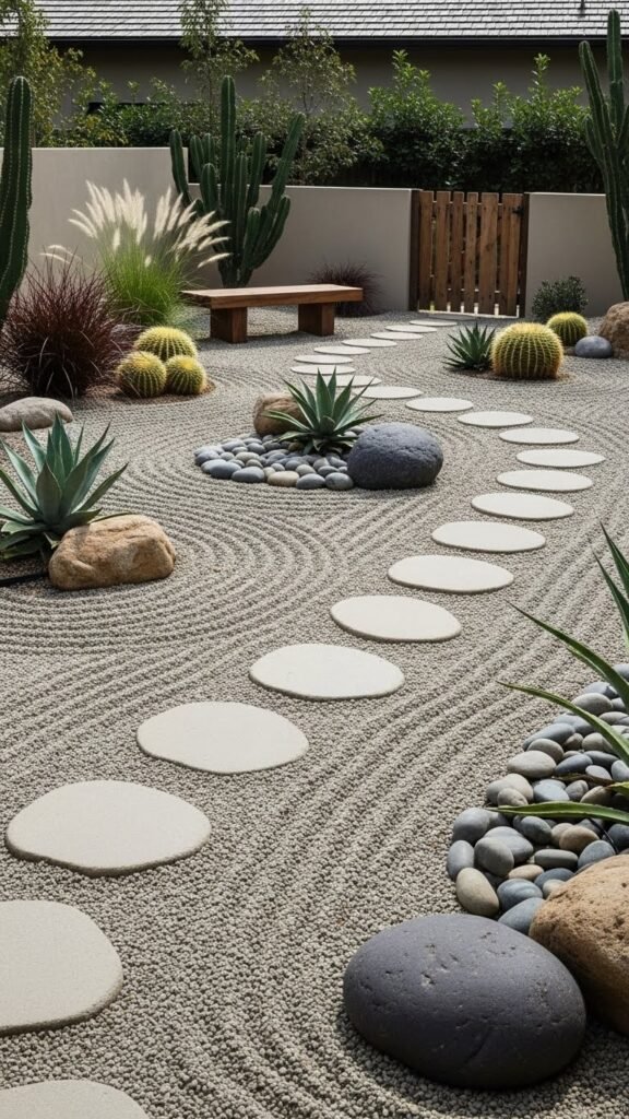 Lean into stillness with a water-wise Zen or gravel courtyard that pares planting back to a few sculptural elements and durable, drought-tolerant materials. You’ll favor a zen gravelscape, raked texture, stepping stones, and gravel paths that guide movement.