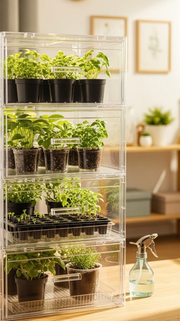 If you liked the portability of the shower-curtain shelter, try a stackable clear plastic drawer greenhouse for a tidy, space-saving alternative. You’ll build a modular stackable terrarium that lets plants bask in light while you rearrange freely.