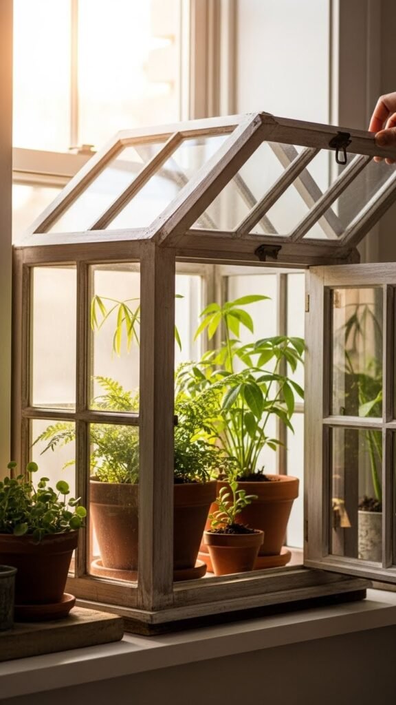 A reclaimed-window mini greenhouse gives you a charm-filled, budget-friendly way to extend your growing season—place an old sash over a shallow shelf or tray of pots, and you’ll trap warmth and light while still being able to lift the pane for ventilation.