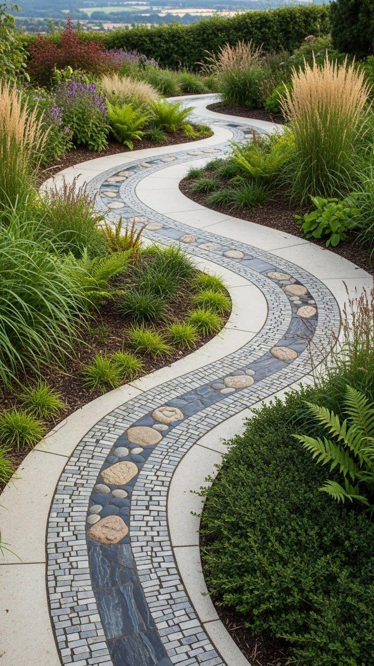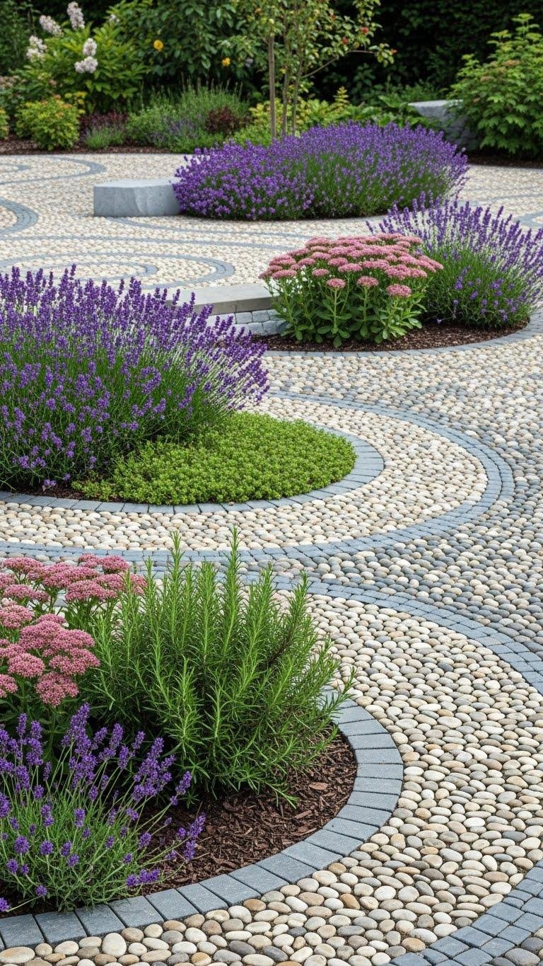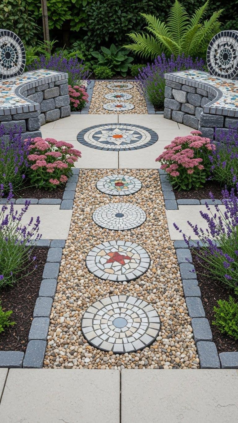 After framing seating with mosaic discs and pavers, let pebble-filled stepping stone edges guide movement and soften boundaries around your plantings.