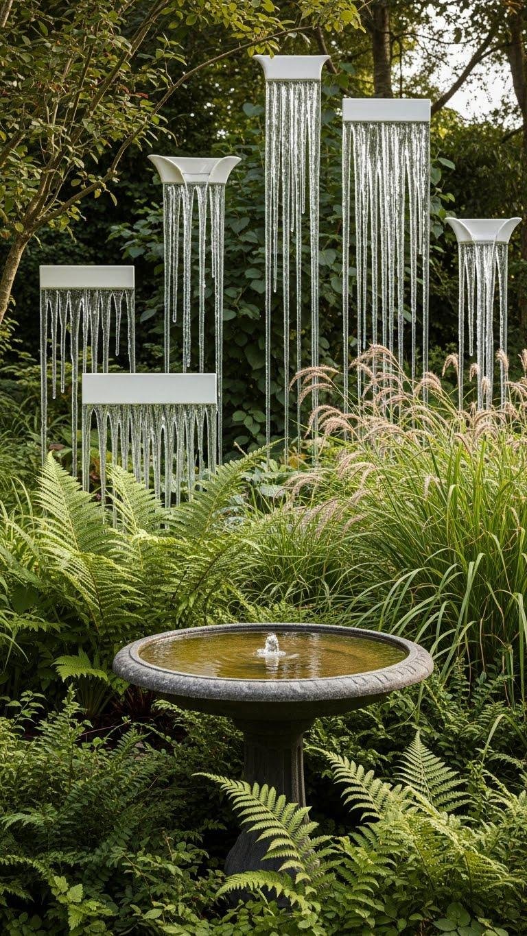 Let the reflective tiles of your birdbath inspire a colder counterpoint: frozen water feature tile cascades use glass and ceramic to catch light in shards and sheets, creating sculptural ribbons that mimic icicles among your plants.