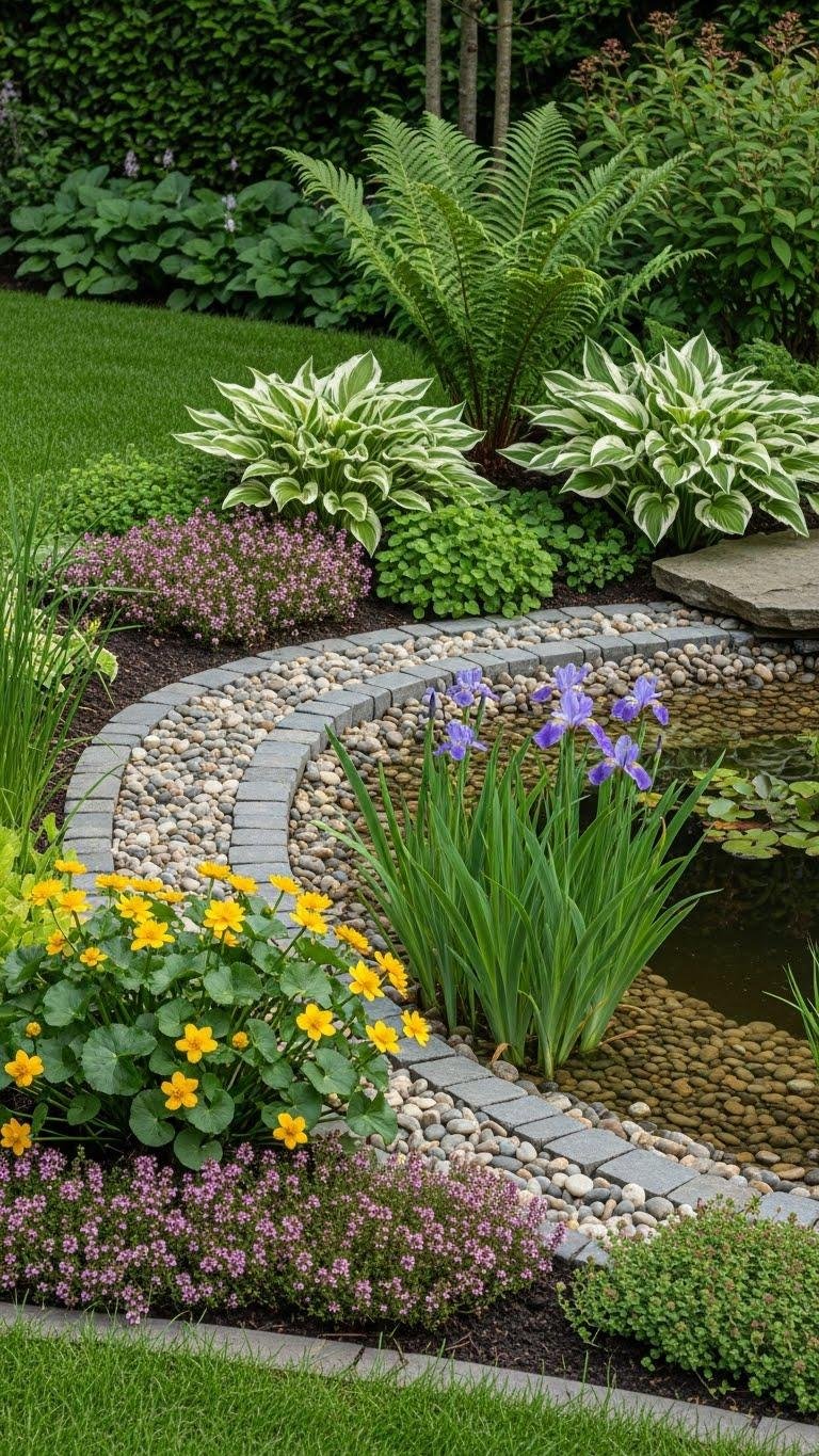 Frame your pond and planting beds with narrow pebble edging strips that echo natural shorelines and keep soil, mulch, and errant stones in check.