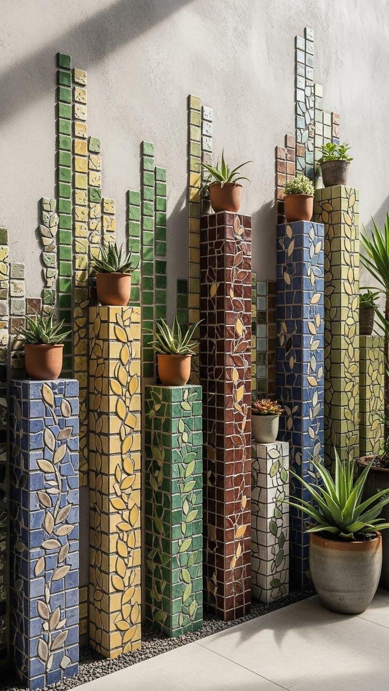 Bring vertical interest to walls with stacked mosaic tile columns that play off your planting layers and sunlight. You’ll place slim vertical columns to echo stems, climbers and spires, using varied tile sizes and colors to mirror foliage. Let textured grout add shadow and tactile contrast.