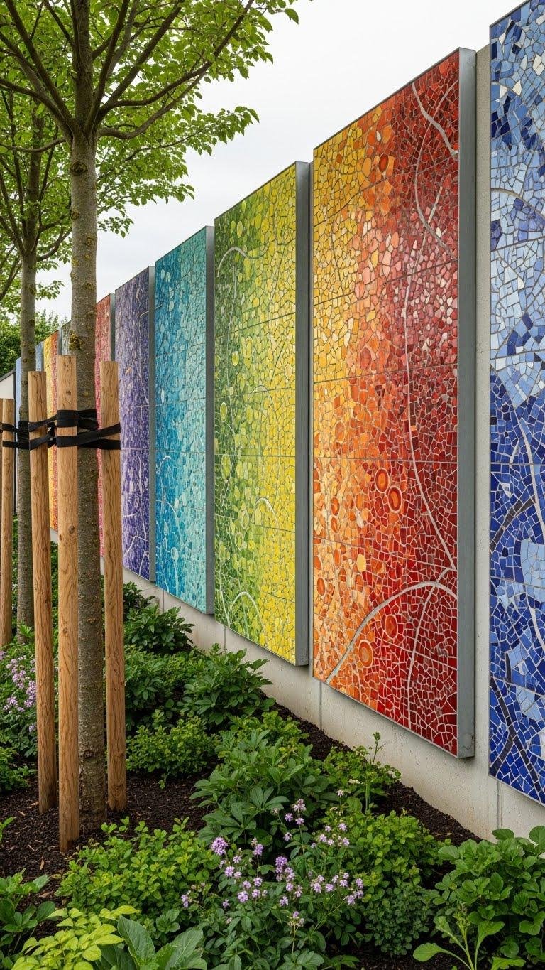 When you arrange a series of abstract mosaic panels along a garden wall, they act like a stitched sequence of seasonal shifts—each panel a distinct study in texture, tone, and movement that echoes beds and canopies.