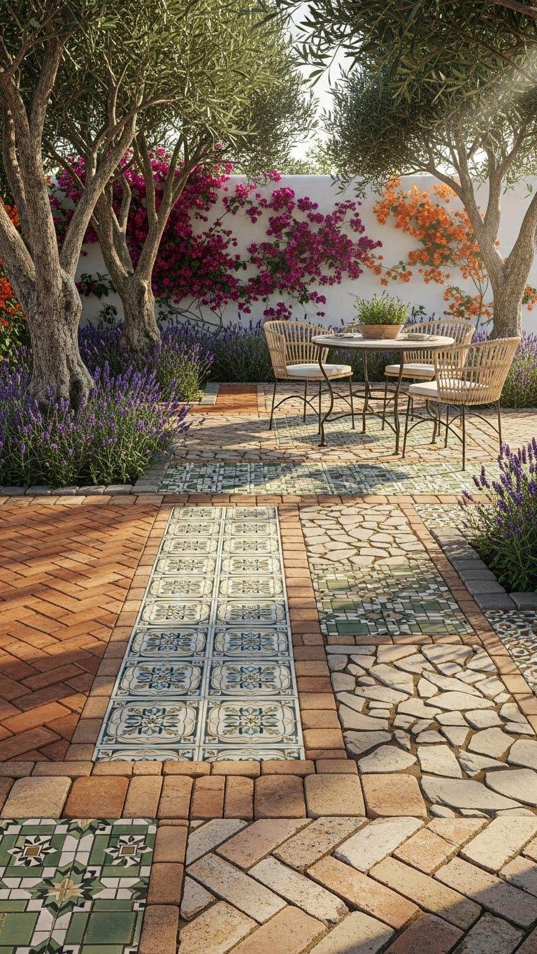 You’ll choose sun drenched tiles and embrace encaustic revival, pairing geometric mosaics with olive, lavender, and cascading bougainvillea for airy, free-flowing outdoor rooms.