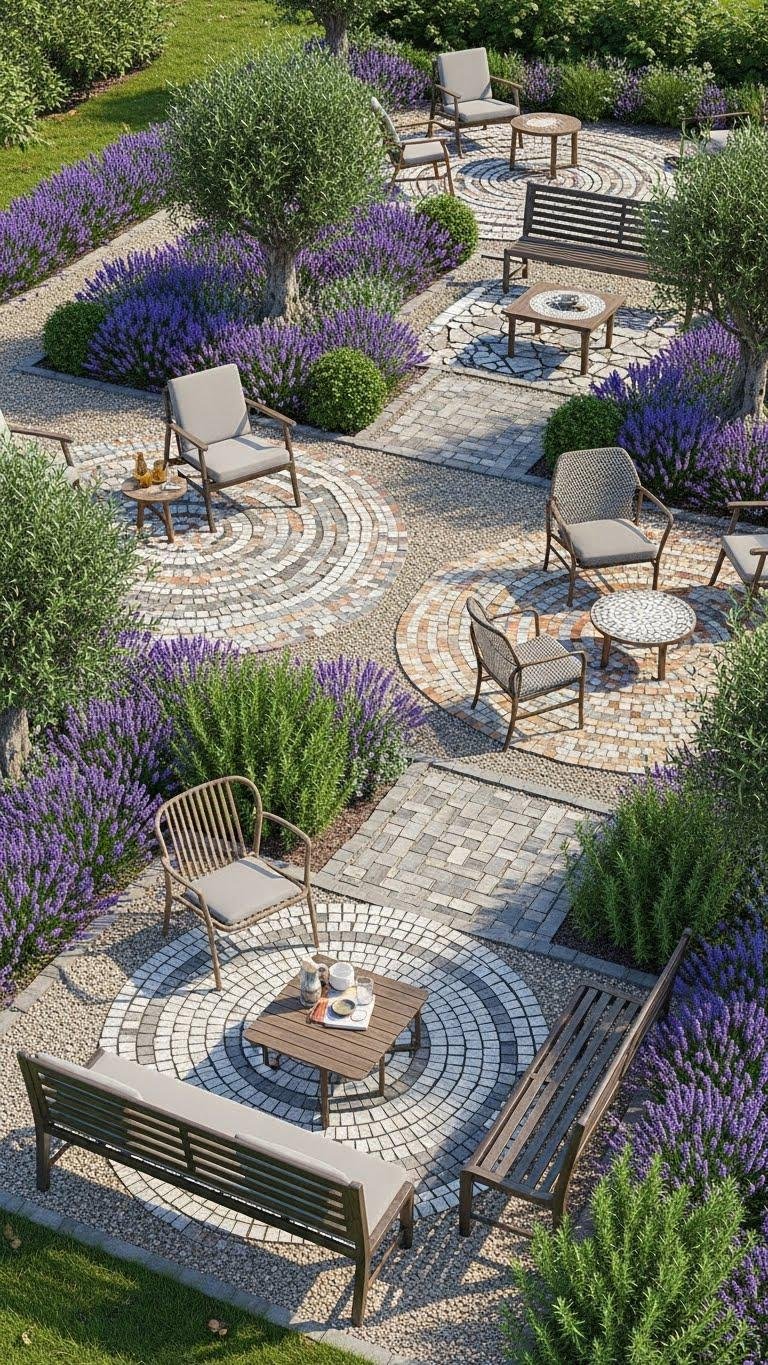 Set into gravel or lawn, mosaic discs and pavers create focused seating islands that read like planted stages—each patterned circle or rectilinear slab frames a chair, bench, or low table and guides foot traffic around beds of lavender, rosemary, and compact olives.