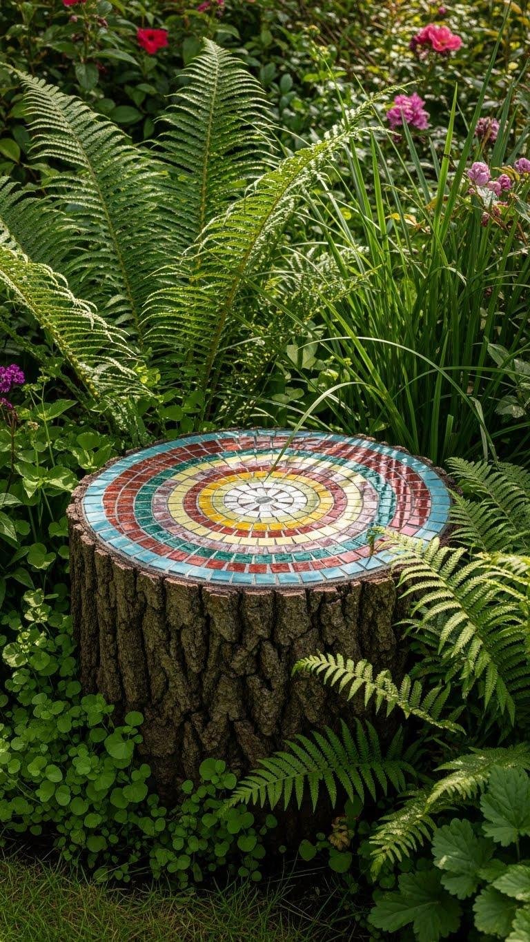 You’ll transform an upcycled stump with concentric mosaic inlays, arranging colorful tesserae to mirror nearby blooms and foliage.
