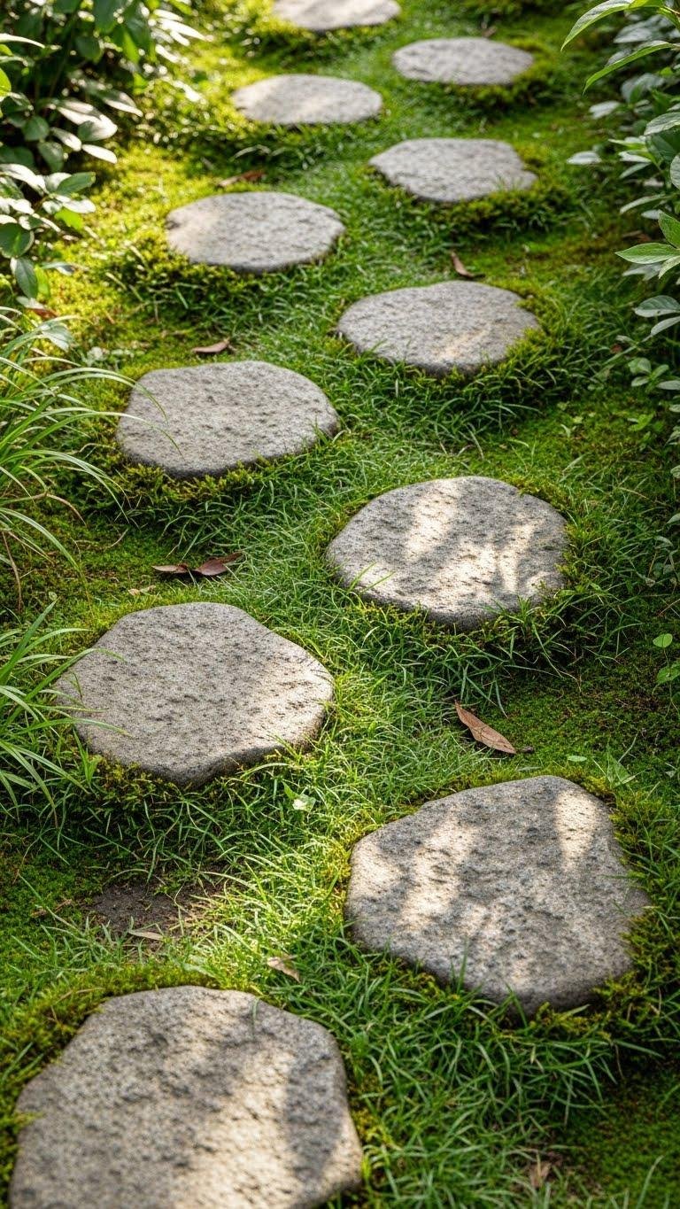 When you weave irregular stepping stones into ribbons of lawn and tuck soft moss into the seams, the path reads as both sculpture and living groundcover—guiding footsteps while celebrating plants’ textures and tones.